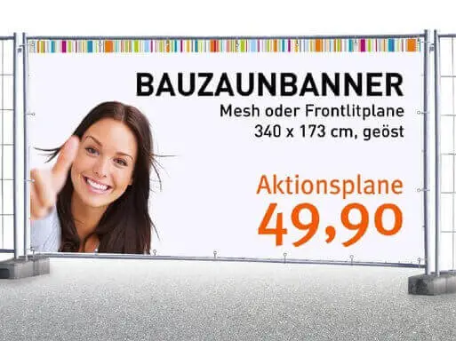 sind nicht nur ein idealer Sichtschutz auf Ihre Baustelle, sie eignen sich perfekt als Werbeträger großflächiger und kostengünstiger Werbemaßnahmen an ihrem Bauzaun. Ihre Werbung wird tausendfach täglich von Passanten und vorbeifahrenden Fahrzeuginsassen gesehen. Bauzaunbanner sind hervorragend als Baustellenschild, als Eventhinweis, für Ihre Werbung an Ihrem mobilen Bauzaunsystem oder als Einfriedung bei einem Konzert geeignet. Wahlweise aus fester PVC-Frontliplane oder Wind-durchlässigem Meshbanner. Ihre Werbebotschaft wird gesehen. Generell sind unsere Zaunbanner für mittel-langfristige Einsätze hergestellt und sind wieder verwendbar. Auch schon von weitem gesehen. Aus 100 % Recyclingmaterial erhältlich. Umweltschonend und nachhaltig mit geruchslosen Latextinten produziert. Bauzaunbanner mit personalisiertem Druck. Wir fertigen hochwertige und nachhaltige Bauzaunbanner nach Ihren Wünschen. Bestellen Sie online unkompliziert Ihre Bauzaunplane. Sie benötigen Ihr Banner kurzfristig? Kein Problem – Expressproduktion und Express-Lieferung möglich. Unterschiedliche Motive werden in der Mengenstaffel nicht gesondert berechnet. Bauzaunbanner preiswert drucken lassen. KV – Kantenverstärkt und geöst. Aktionsplane nur geschnitten und geöst. Die Bauzaunbanner werden bereits Kantenverstärkt und geöst geliefert. Bauzaunbanner online drucken und gestalten.